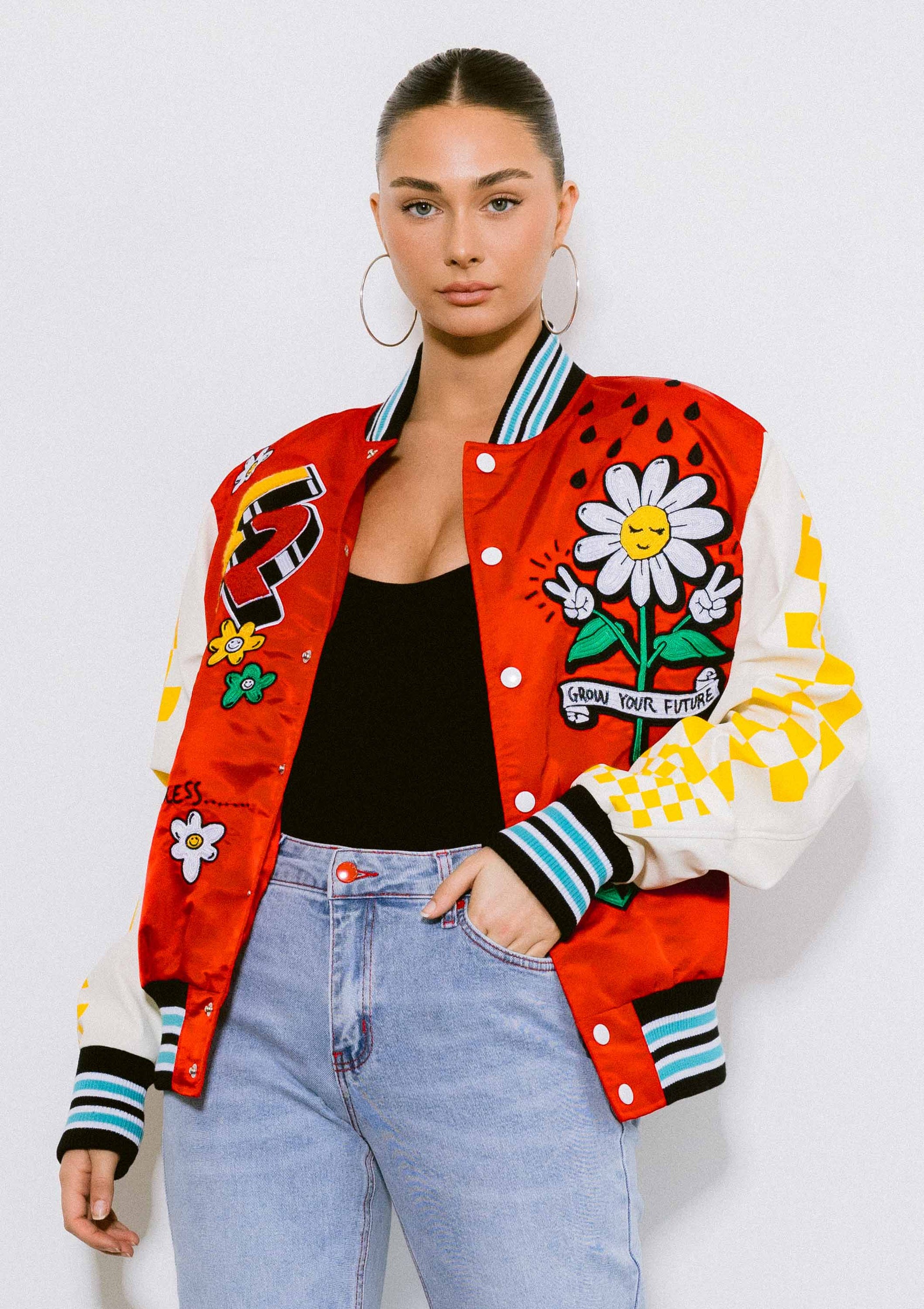 It features exclusively designed multi chenille patches with chain stitches, faux leather contrast sleeves, front double welt pockets and a snap button closure.